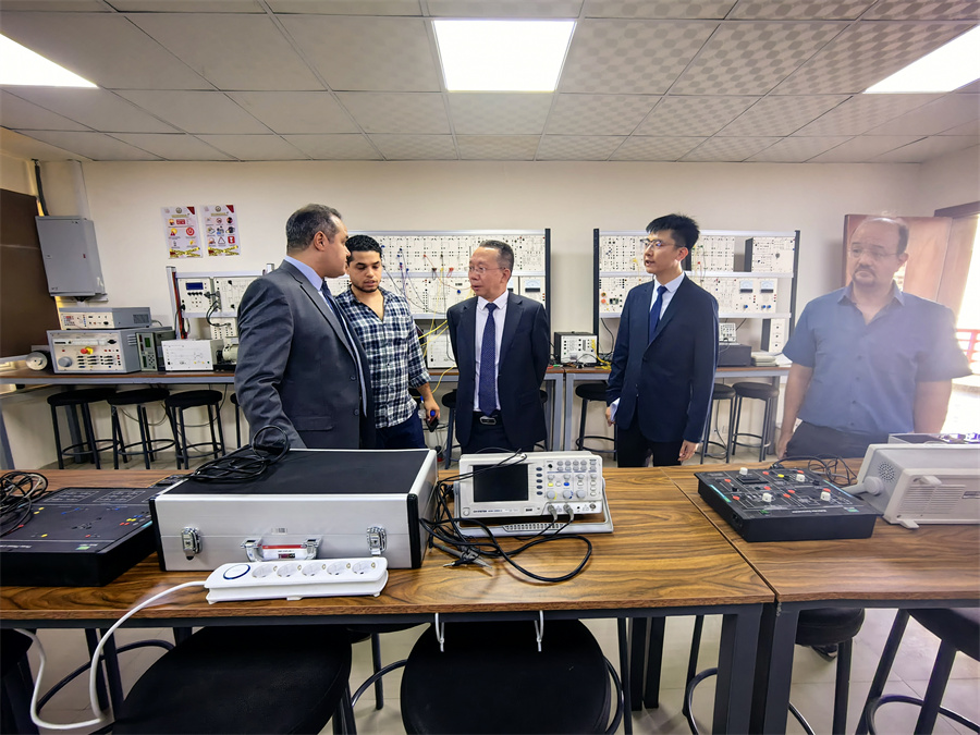 7月13日,代表团还访问了新开罗技术大学,与校长塔雷克·阿卜杜勒·马拉克·米哈伊尔举行会谈。任喜莹介绍了我校发展历程、工程技术学科发展情况及服务地方经济社会发展的实践成果。他表示,两校在人才培养理念方面高度契合,希望以人才培养、师生交流、科技创新、成果转化为切入点,建立两校长效合作机制,携手打造中埃合作标杆。米哈伊尔介绍,该校是近年来埃及政府规划成立的新型技术大学之一,致力于培养多领域创新型、服务国家需求和高技能型人才。他高度赞扬了我校的办学水平和成就,并表达了与我校开展实质性合作的愿望。